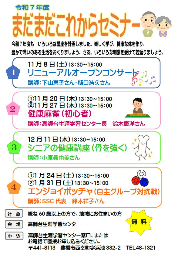 講座は、「出会い、ふれ合い、学びあい」の場所です。どなたでも受講できます。生涯学習の場としてご利用下さい。広報とよはし、情報誌グラッド、センターだより、ホームペ―ジ、フェイスブックなどで