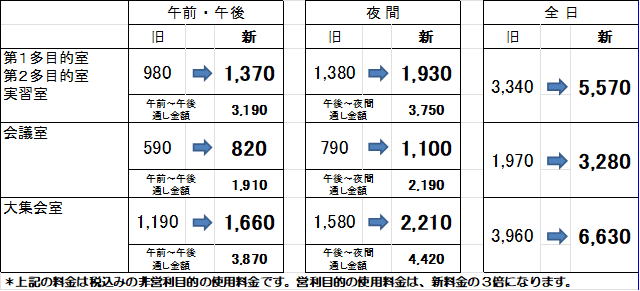部屋予約受付は、自主グループの活動や自治会等の活動のような非営利目的の使用の場合と会社・団体・個人講師主催の○○教室や△△塾のような営利目的の使用の場合で、下表のようになります。